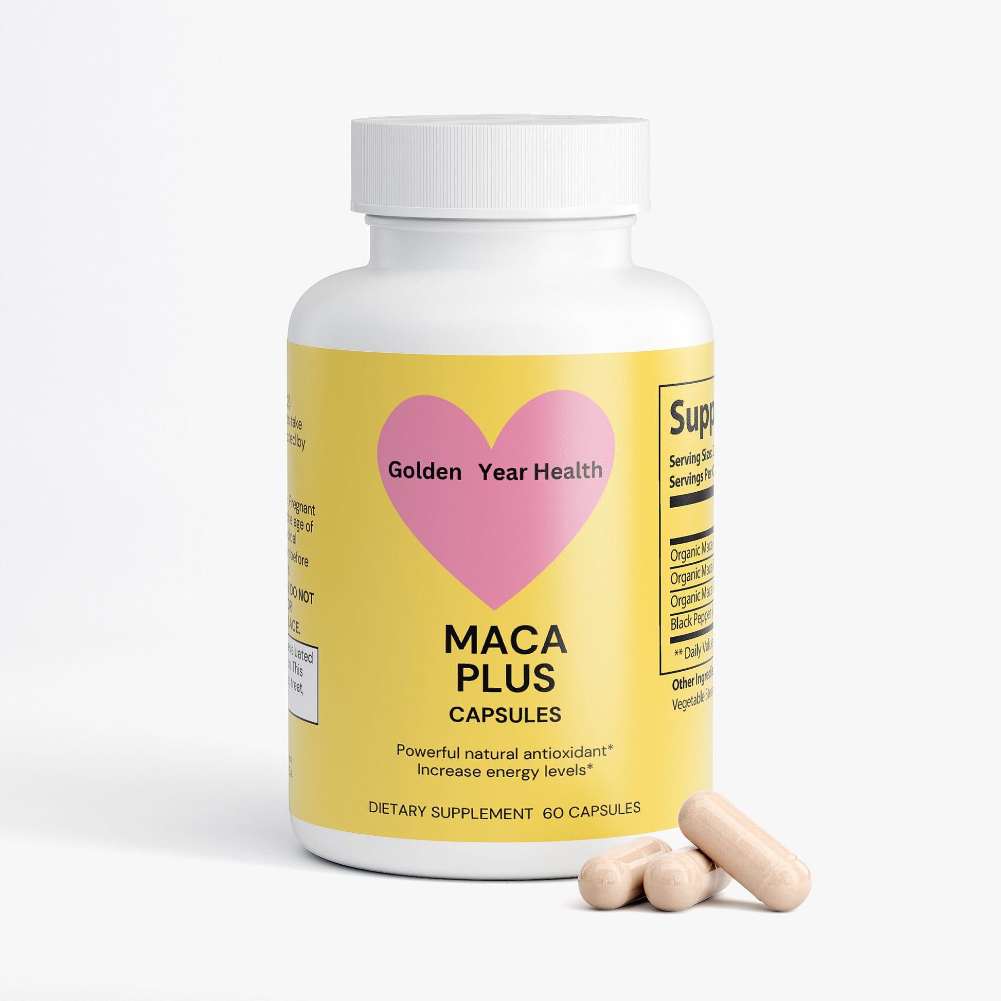 Ingredients: Organic Maca Root (Black), Organic Maca Root (Red), Organic Maca Root (Yellow), Black Pepper, Cellulose (Vegetable Capsule), Vegetable Stearate.